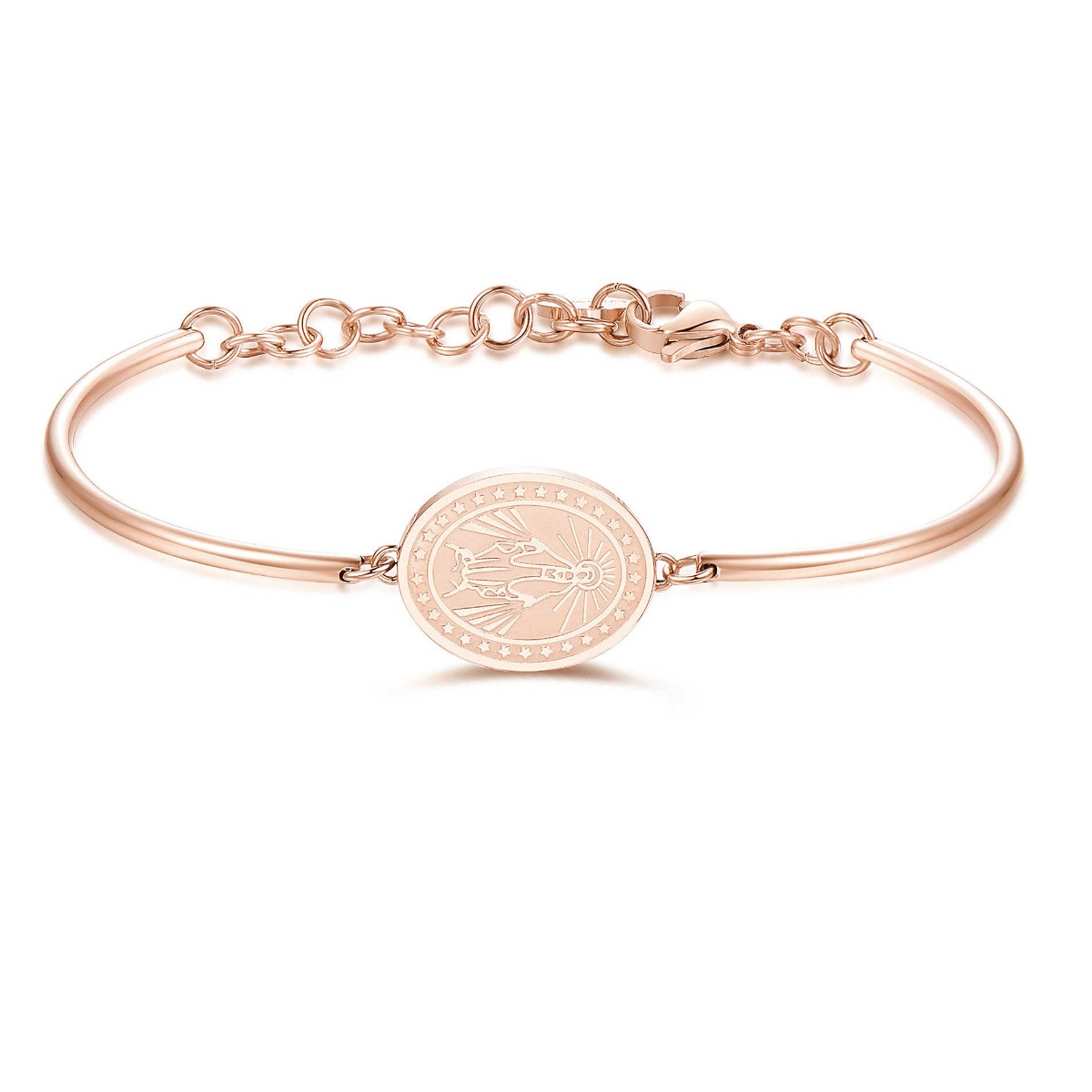 Bracciale semirigido in acciaio placcato oro rosè con medaglietta incisa Maria Vergine.