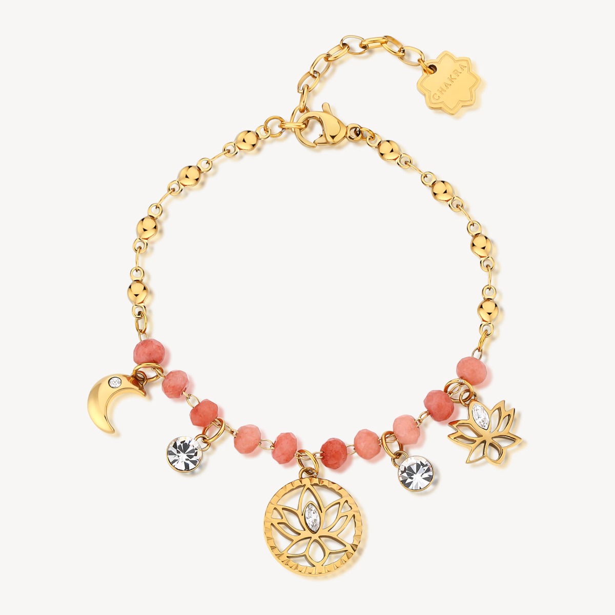 Bracciale in acciaio 316L e finitura pvd oro 14K con calcedonio colore corallo, pendenti a forma di fiore di loto, luna e cristalli.