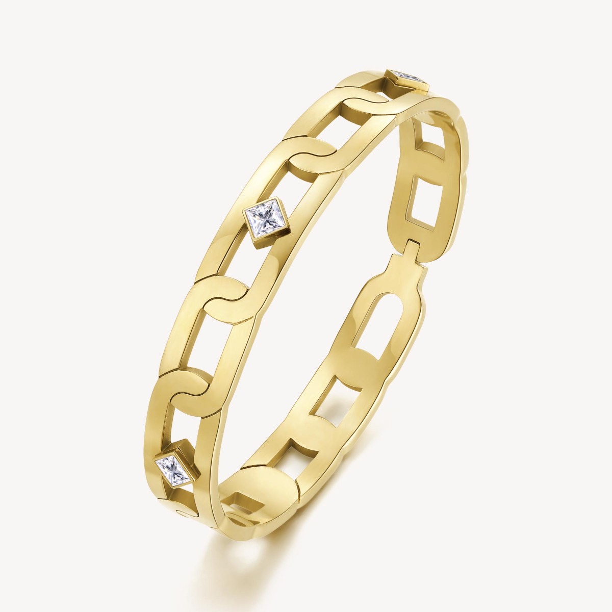 Bracciale rigido in acciaio 316L e finitura pvd oro 14K con incisione e cristalli.