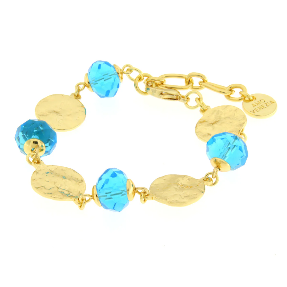 Bracciale da donna BySimon della collezione Amo Venezia in Metallo placcato oro con piastre martellate e cristalli azzurri.