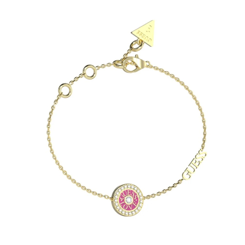 Bracciale a catena da Donna in Acciaio dorato con elemento centrale Tondo Fucsia con Cristalli Bianchi e Scritta Guess Love.