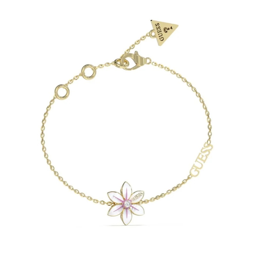 BraccialeGuess da Donna in Acciaio Dorato con Fiore Smaltato e Scritta Guess Sulla Catena.