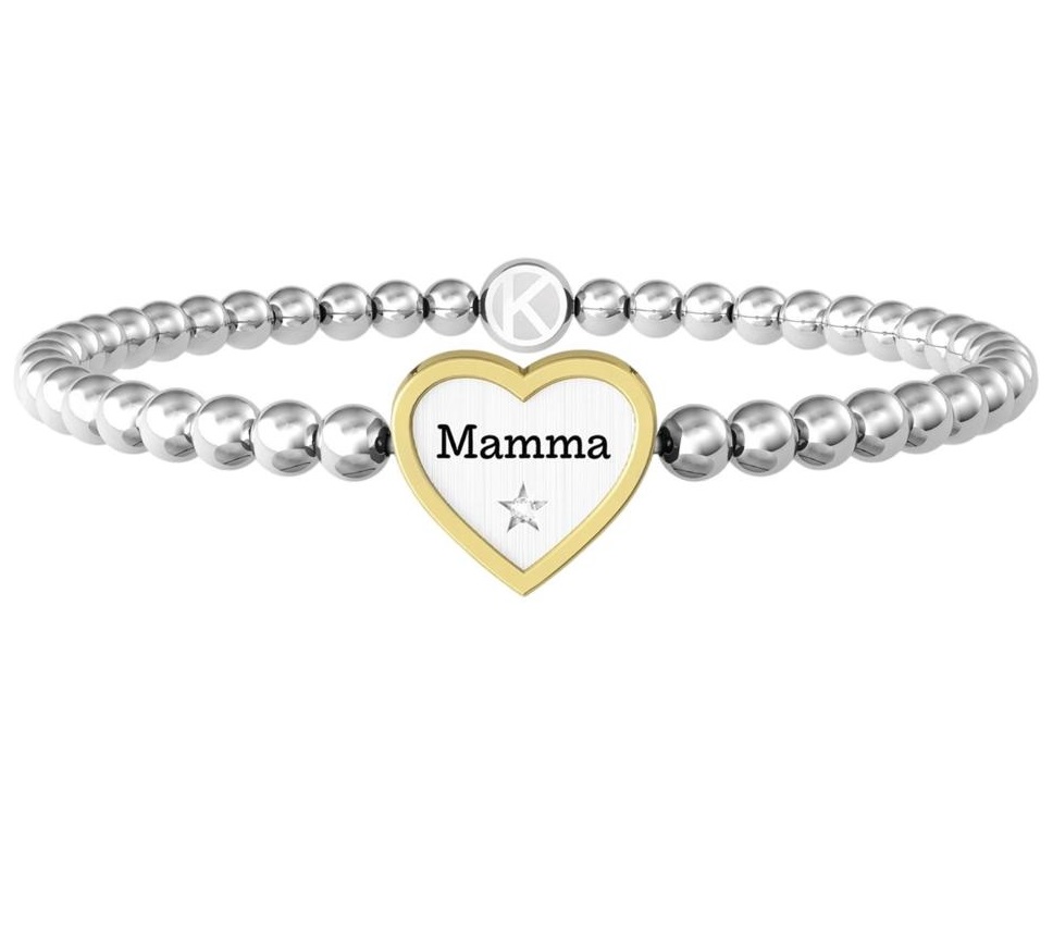 Bracciale elastico in acciaio con sfere lucide e ciondolo satinato a forma di cuore con cristallo bianco, bordo in PVD giallo e scritta “Mamma”.