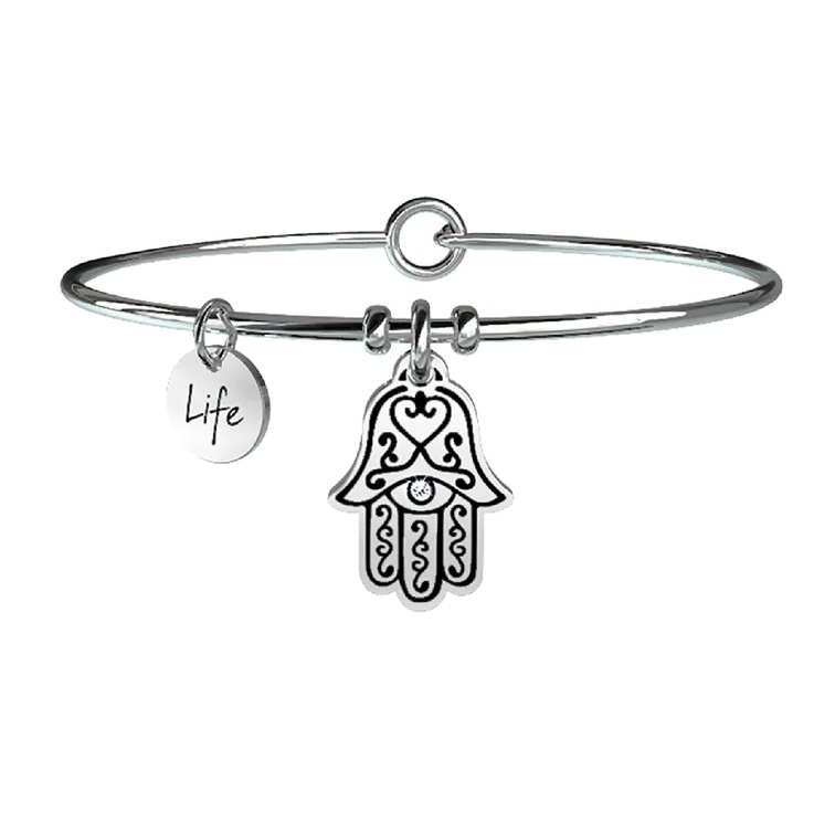 Bracciale bangle in acciaio con ciondolo a forma di Mano di Fatima e smalto nero.