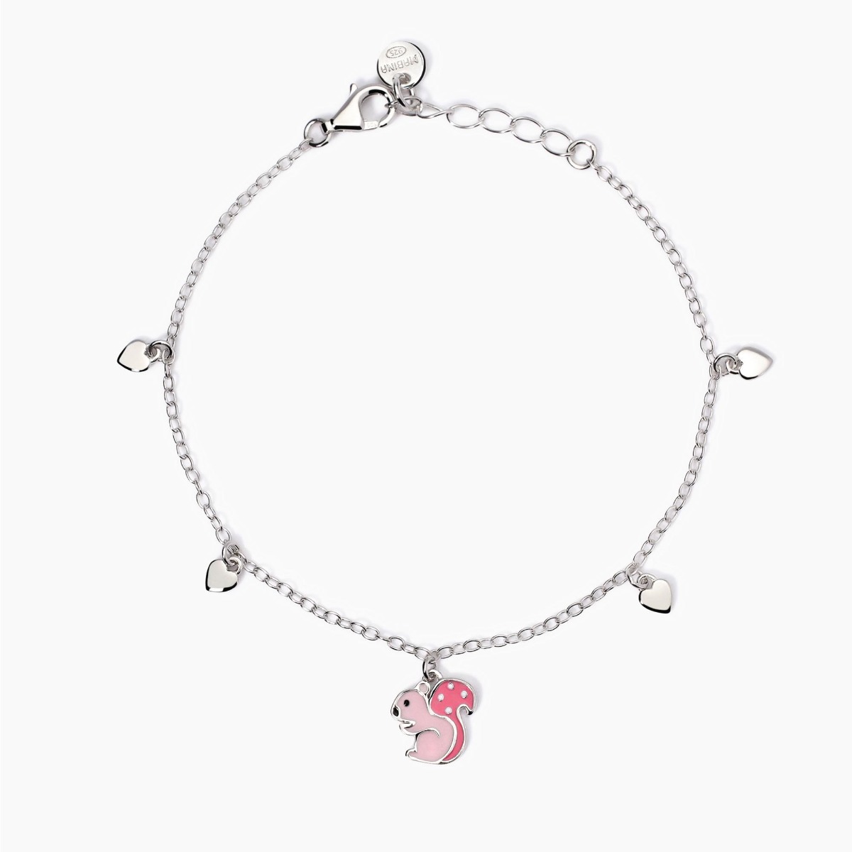 Bracciale regolabile da bambina in argento rodiato con catena rolò, charm a forma di cuoricini e charm centrale smaltato a forma di scoiattolino.