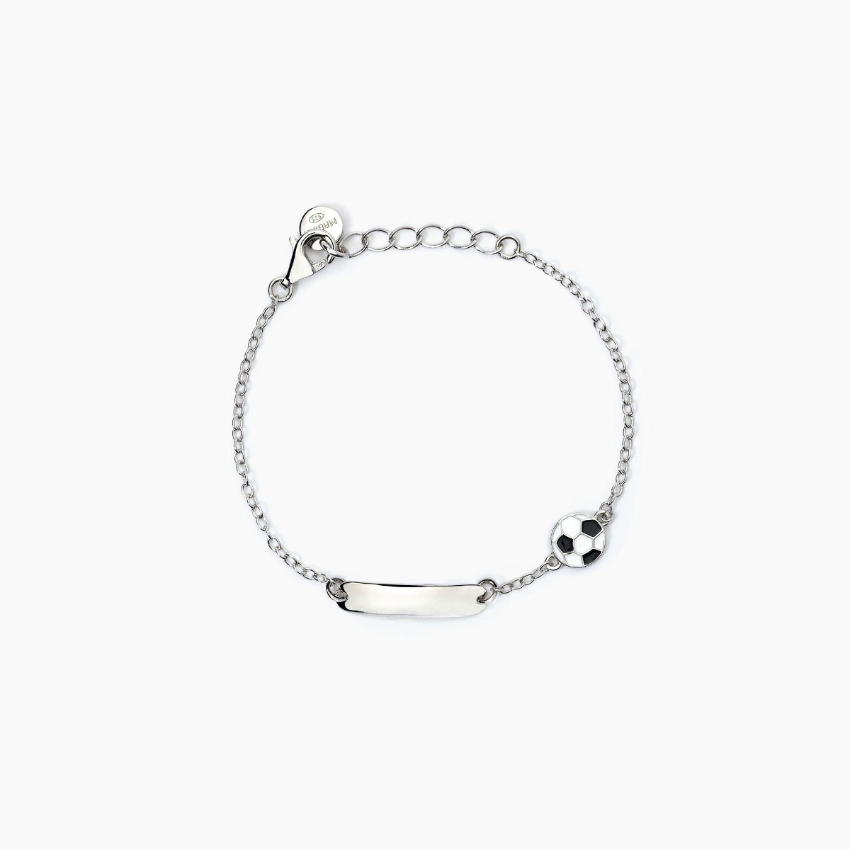 Bracciale neonato regolabile in argento rodiato con catena forzatina, piastra personalizzabile e pallone da calcio smaltato. Un gioiello adatto alle occasioni speciali grazie alla possibilità di effettuare incisioni, es. date, iniziali o nomi.