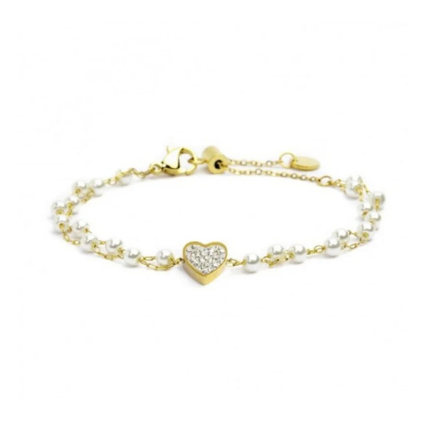 Bracciale in acciaio con trattamento in pvd oro composto da doppia catena e perle sintetiche, al centro un cuore in pavè di cristalli bianchi sul davanti e raggi incisi che formano un cuore sul retro.