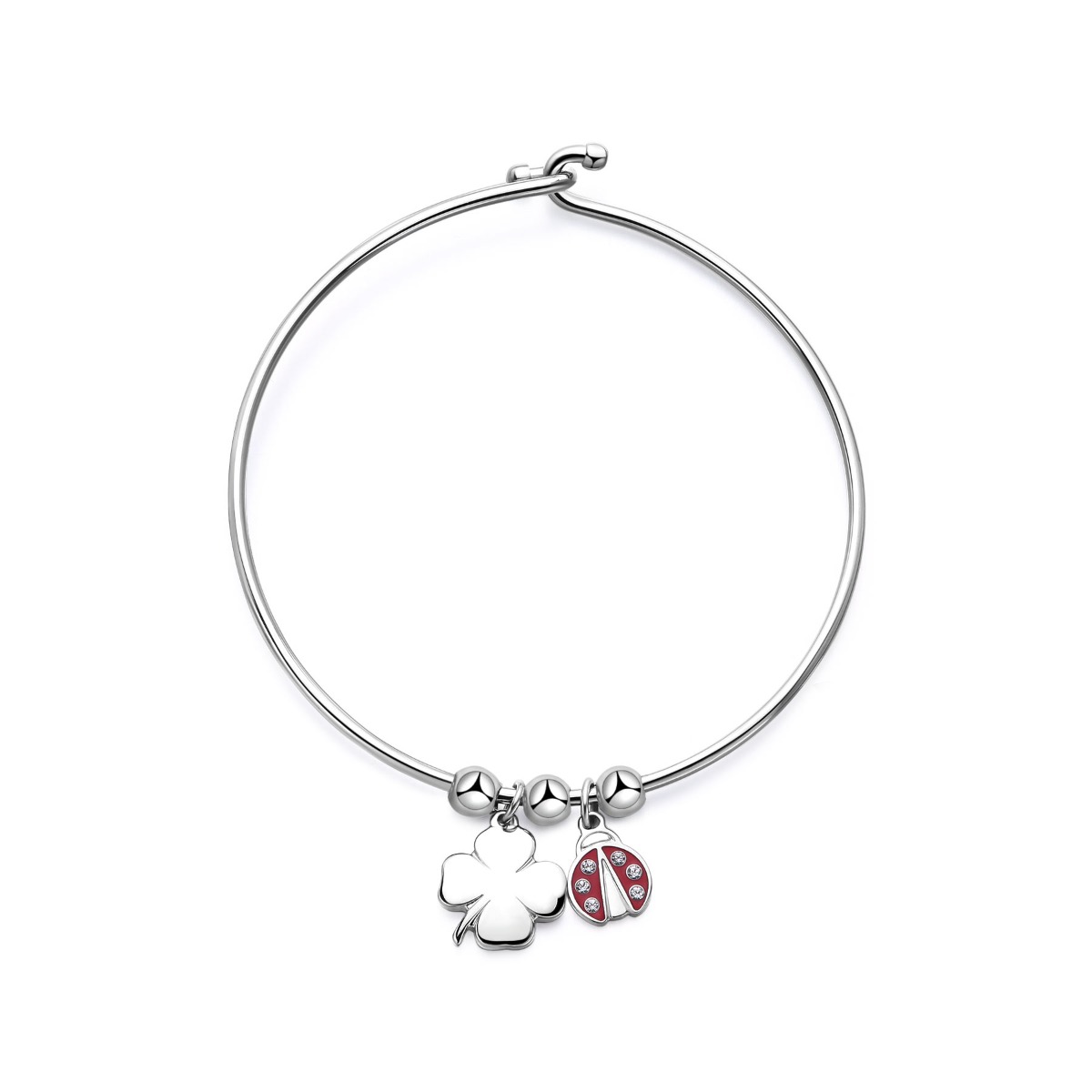 Bracciale rigido in acciaio 316L con sfere in acciaio e pendenti a forma di quadrifoglio e coccinella con smalto rosso e cristalli.