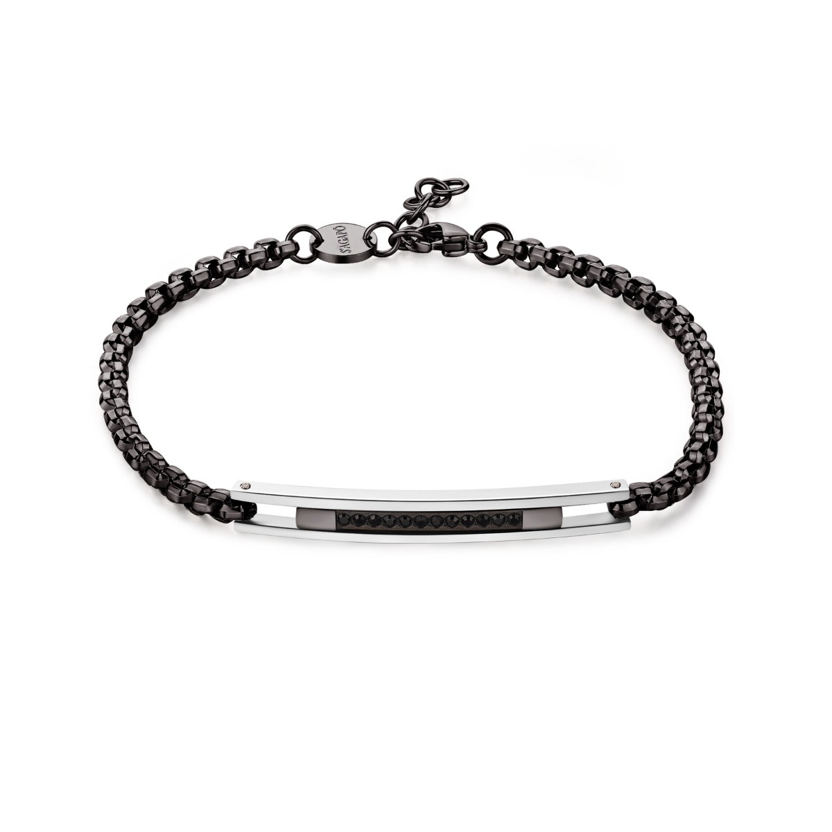 Bracciale in acciaio 316L con catena rolò quadrata in finitura pvd colore rutenio e centrale con cristalli neri.