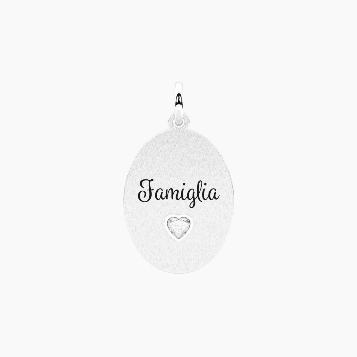 Ciondolo ovale in acciaio satinato e lucido con cristallo bianco taglio cuore e scritta "Famiglia, dove la vita ha inizio e l'amore non finisce mai".