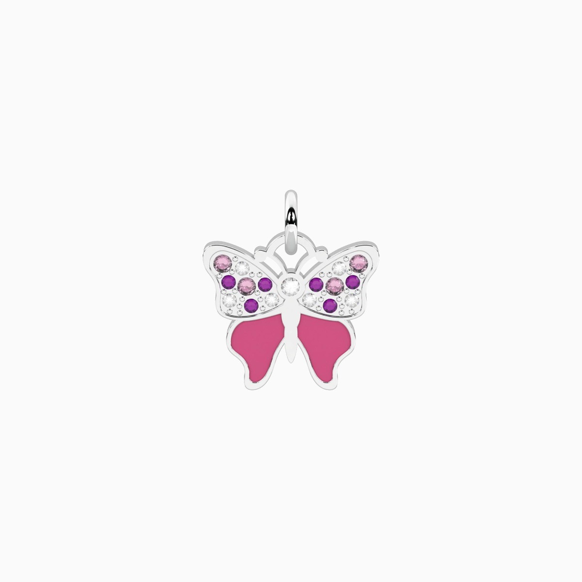 Ciondolo in acciaio a forma di farfalla smaltata con cristalli rosa.