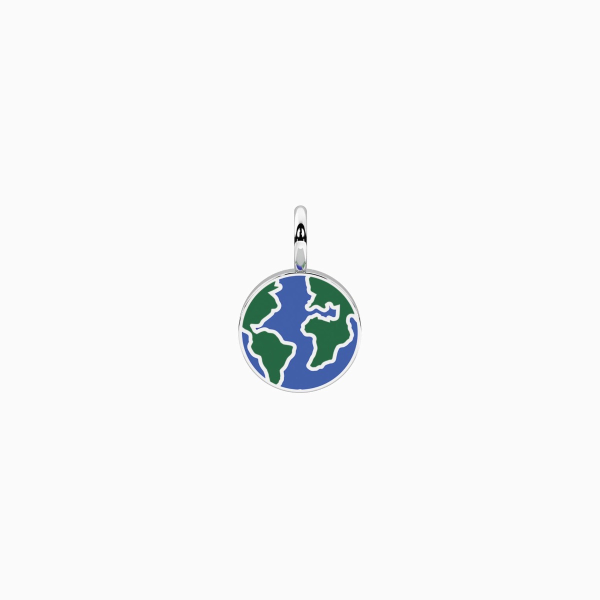 Ciondolo in acciaio smaltato a forma di mappamondo e scritta "Travel the world".
