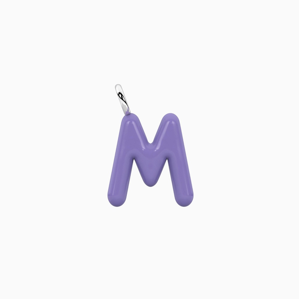 Ciondolo in acciaio smaltato viola a forma di lettera "M".