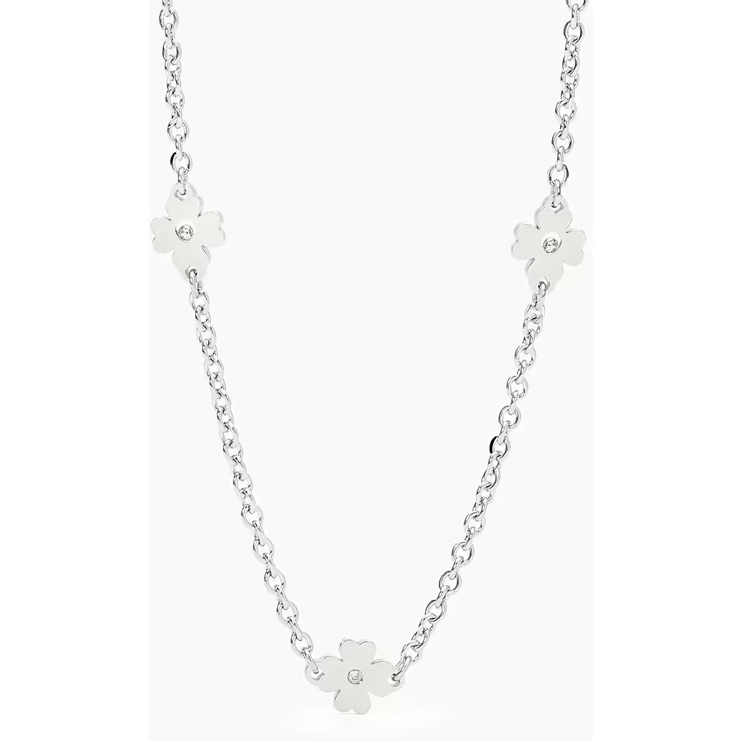 Collana in acciaio inossidabile con catena forzatina 2 mm, elementi quadrifoglio 10x7.5 mm e cristalli Ø 1.5 mm