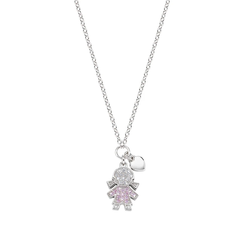 Collana in argento 925 rodiato con doppio pendente cuore e bimba con zirconi bianchi e rosa.