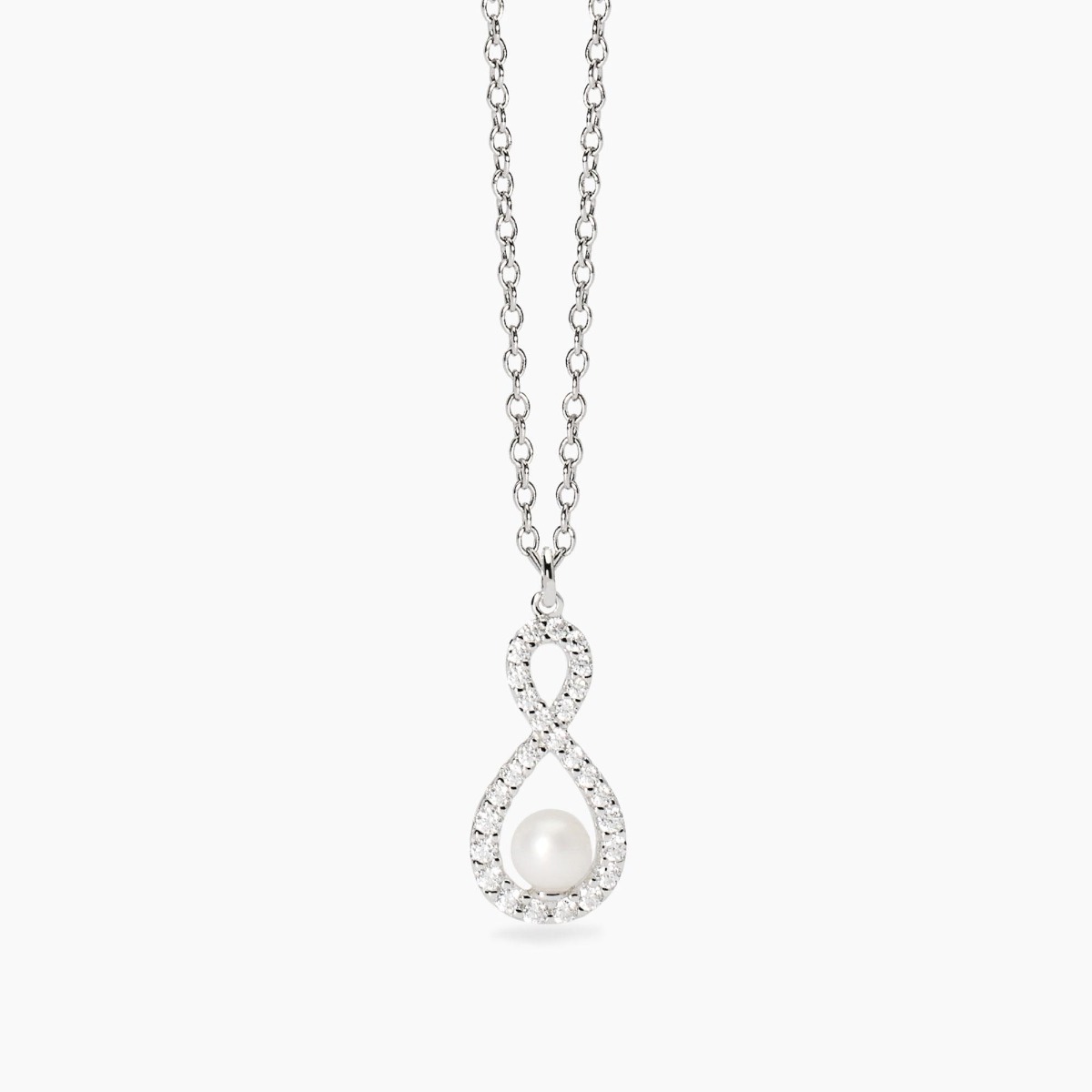 Girocollo in argento con catena rolò e pendente forma infinito in zirconi e perla coltivata.