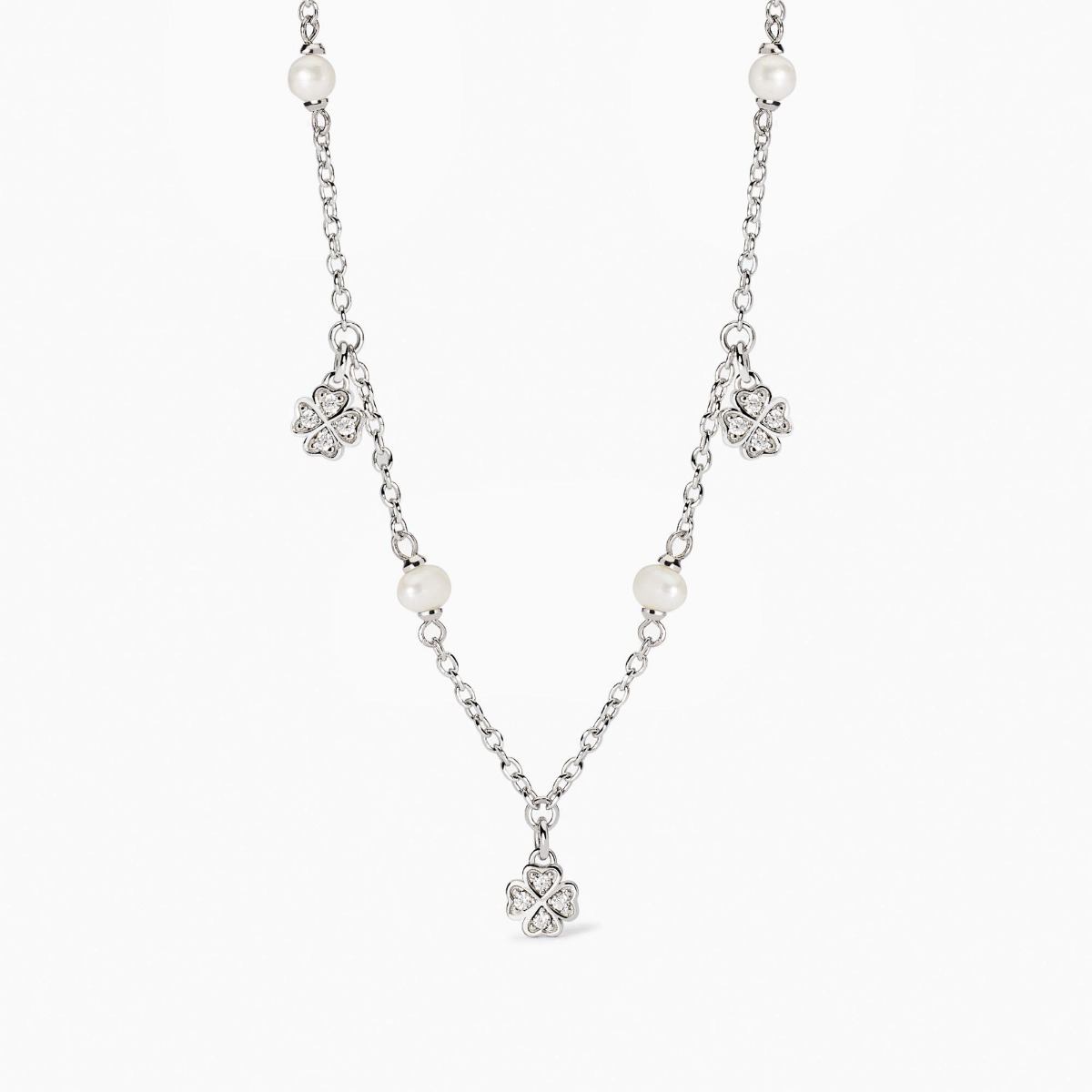 Girocollo regolabile da donna in argento rodiato con catena rolò, perle coltivate e ciondoli quadrifoglio con zirconi.