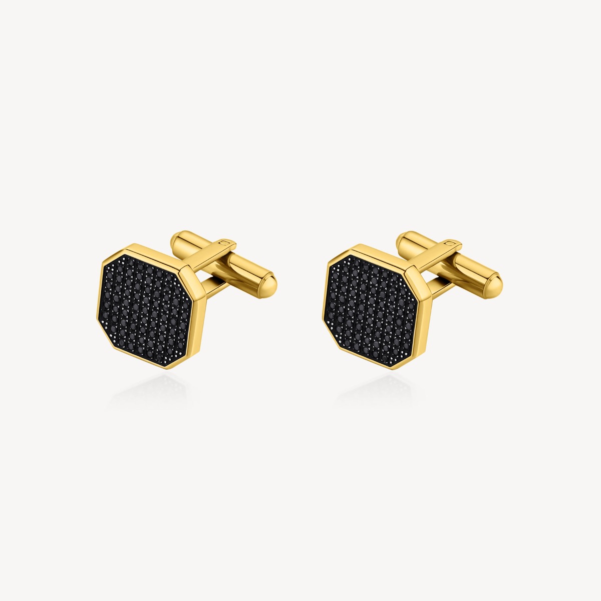 Gemelli in acciaio 316L e finitura pvd oro 14K con zirconi neri.