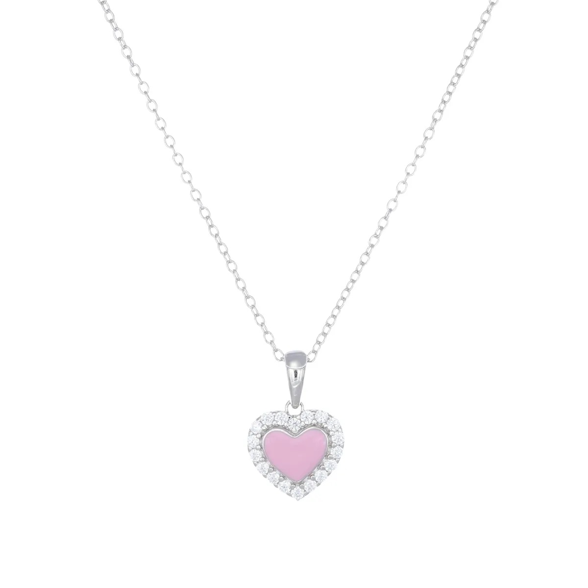 Collana a catena in Argento 925 rodiato. Cuore pendente smaltato rosa e bordo di zirconi bianchi.