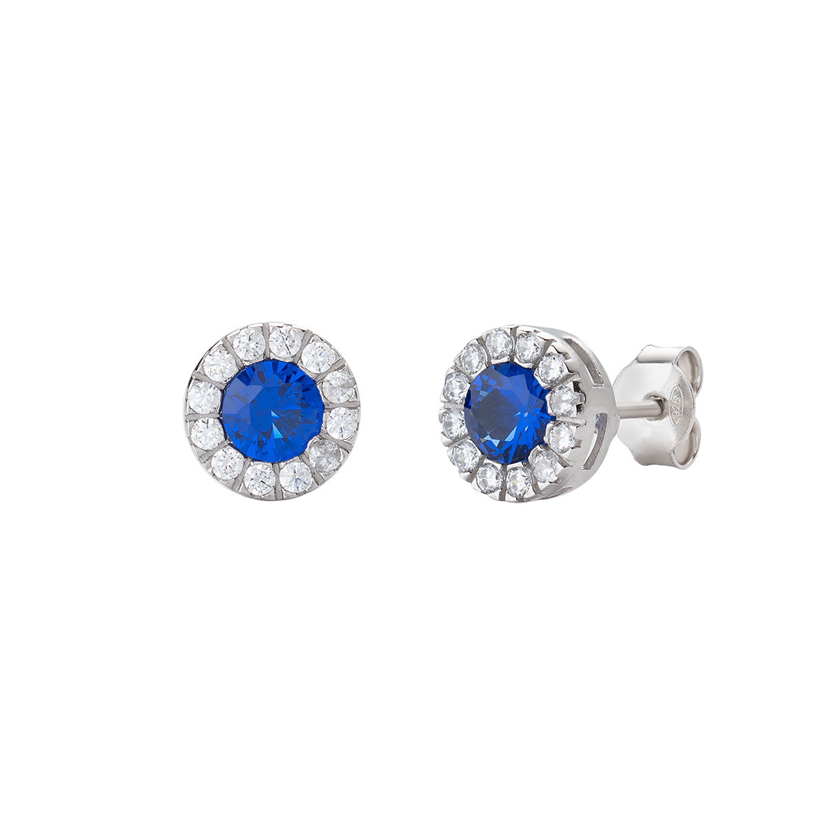Orecchini in argento placcatura rodio con zirconi bianchi e blu - Ø 9mm.