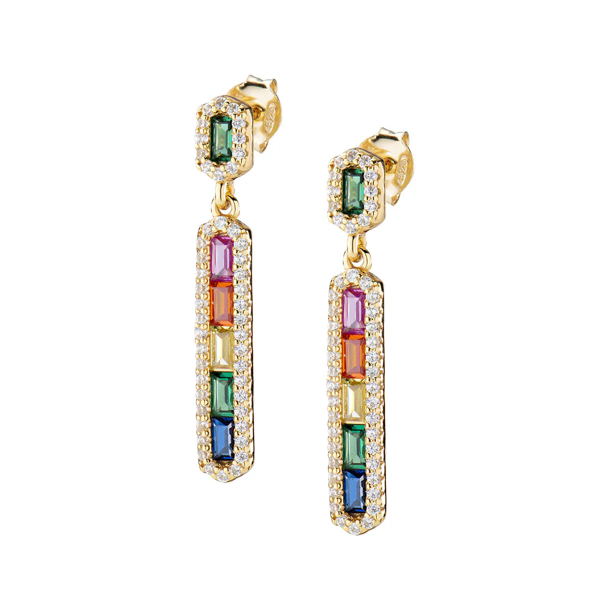 Orecchini pendenti in argento 925 dorato con deliziosi zirconi multicolor taglio baguette e chiusura a farfallina. Lunghezza totale: 2,8 cm. Sono allegri, supercolorati e divertenti! Un arcobaleno da indossare.
