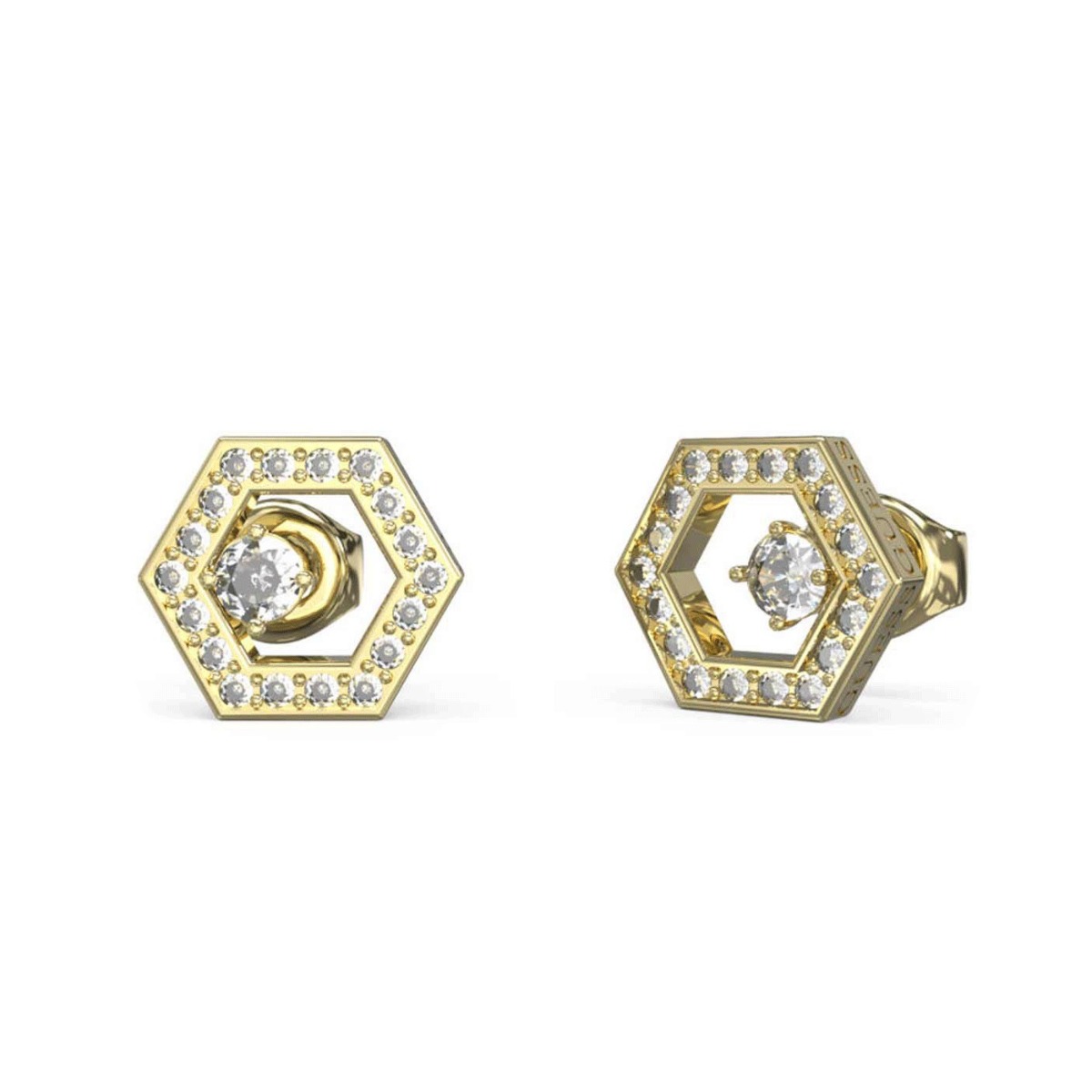 Orecchini da donna Guess a Lobo da Donna in acciaio Dorato con Logo 4G e Cristalli Bianchi.