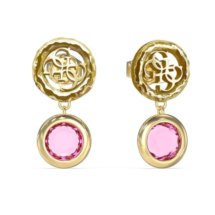 Orecchini da donna Guess pendenti in Acciaio dorato con cristalli di colore giallo/fucsia e logo 4g.