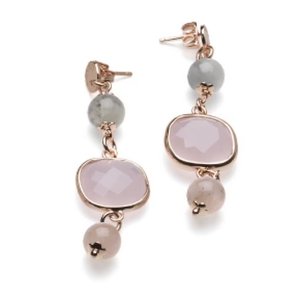 Orecchini in ottone placcato oro rosè impreziosito da quarzo naturale multicolor, cristallo rosa e perla di fiume.