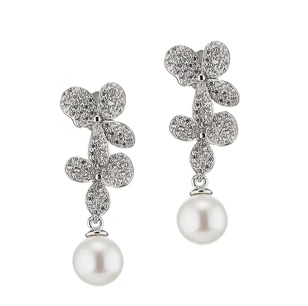 Orecchini pendenti realizzati in argento 925 con zirconia cubica e perle.
