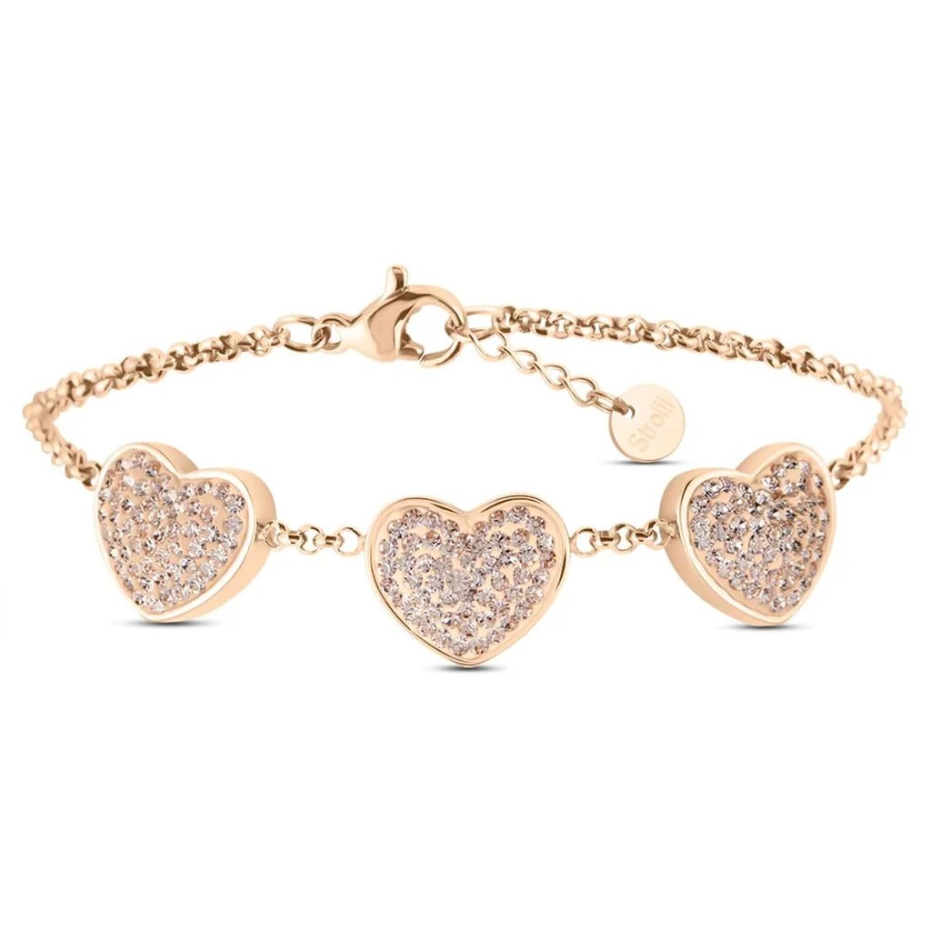 Bracciale motivo Cuore in acciaio finitura oro rosa e cristalli rosa.