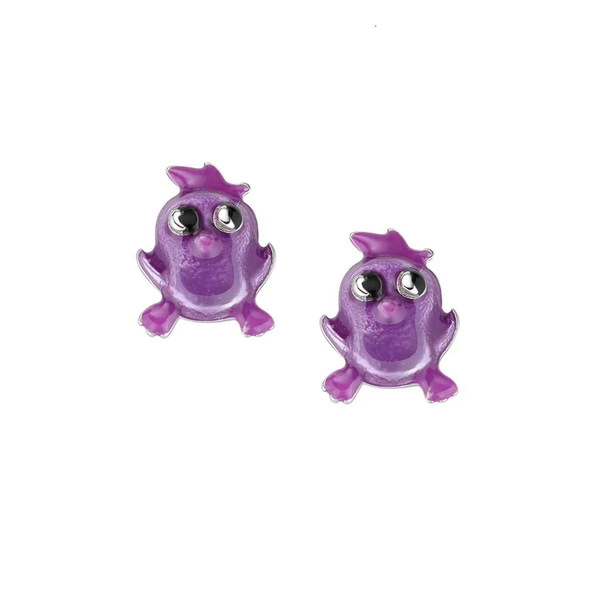 Orecchini uccellino da bambino in argento sterling; Un uccellino colorato e giocoso sta arrivando! Dalla collezione Arca di Noè di Amen, piccoli orecchini a lobo in argento sterling 925 rodiato con smalto viola, fucsia, bianco e nero. Chiusura a farfalla.