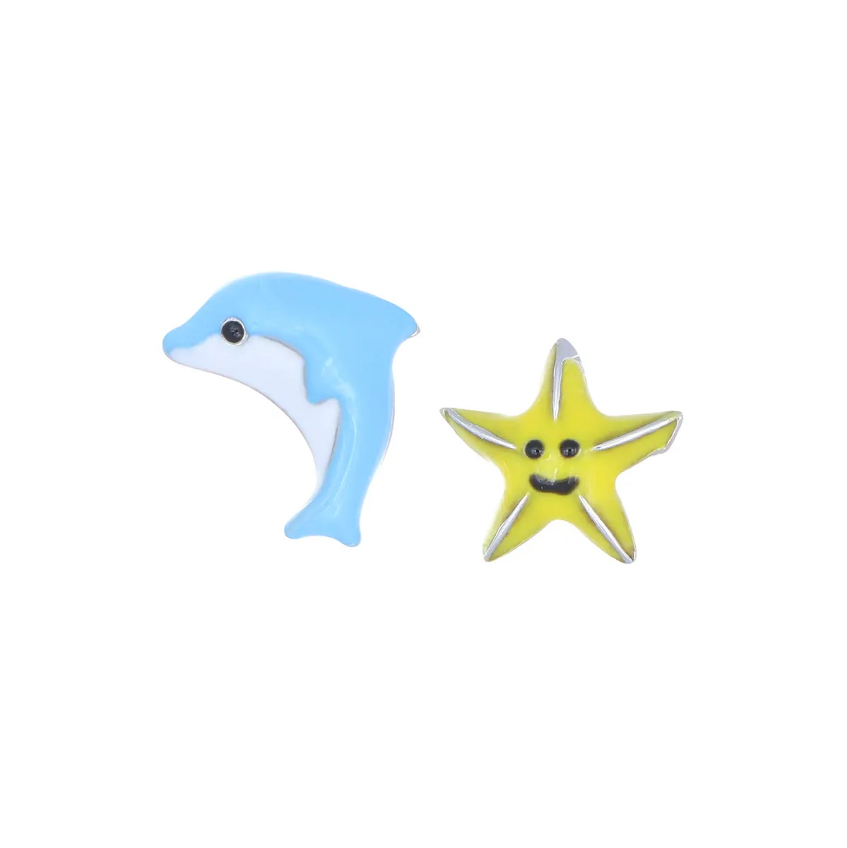 Orecchini da bambino con delfino e stella marina in argento sterling; Un delfino e una stella marina della collezione per bambini L'Arca di Noè di Amen fanno capolino dalle onde! Piccoli orecchini a lobo in argento sterling 925 rodiato con smalto bianco, blu, nero e giallo, chiusura a farfalla.