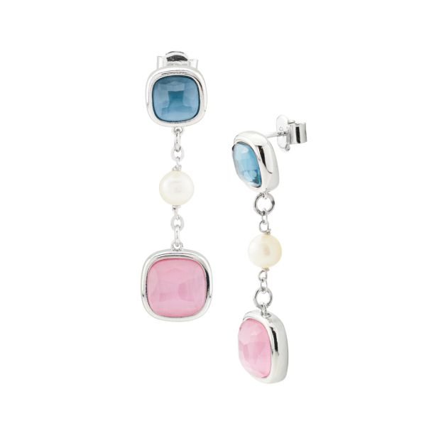 Orecchini rodiati con cristalli pendenti color tormalina rosa e acquamarina, separati da una perla.