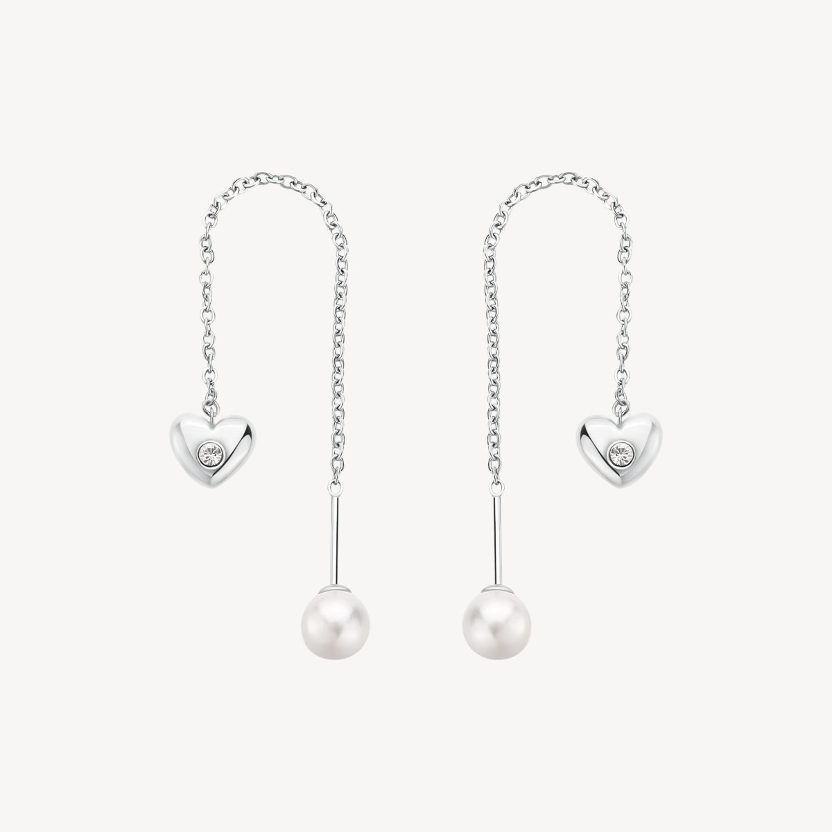 Orecchini da donna Brosway della collezione Chakra. Orecchini saliscendi in acciaio 316L con pendenti a forma di cuore, perle di conchiglia e cristalli.