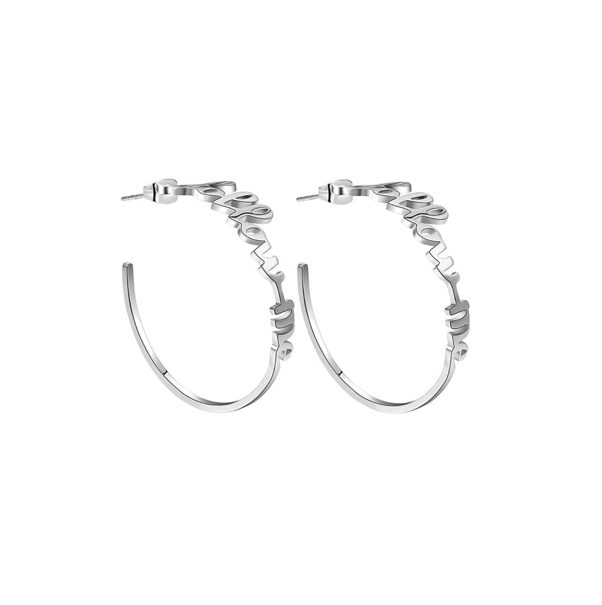 Orecchini in acciaio inossidabile 316L con dettagli a forma di scritta "follow" e "me".