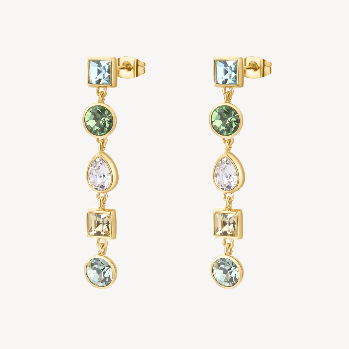 Orecchini pendenti lunghi in acciaio 316L, finitura pvd oro 14K con cristalli chiari e nei colori chrysolite, aqua bohemica, peridot e jonquil.