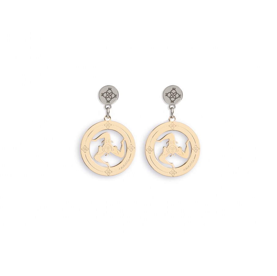 Orecchini pendenti donna in acciaio pvd oro traforato con simbolo della Trinacria.