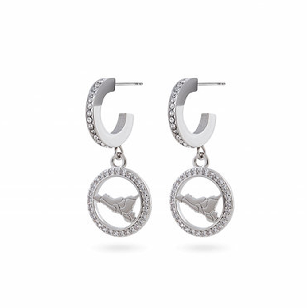 Orecchini pendenti donna in acciaio traforato con simbolo della Sicilia e cristalli.
