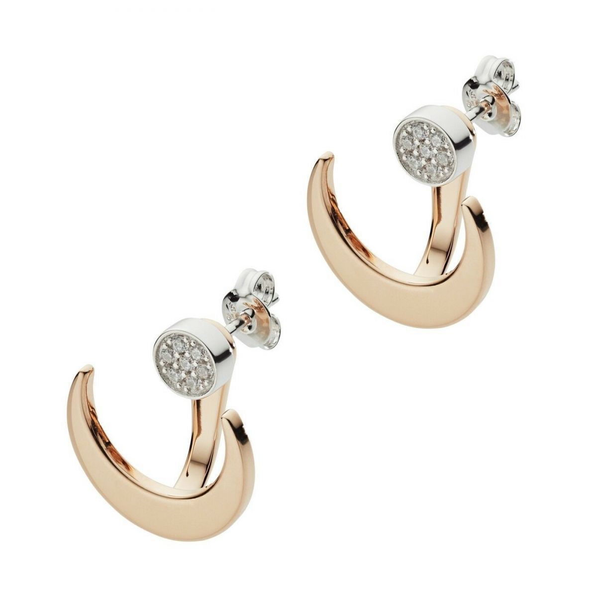 Orecchini a lobo in argento 925 con simbolo Luna finitura oro rosa, elemento centrale finitura rodio e zirconi bianchi.
