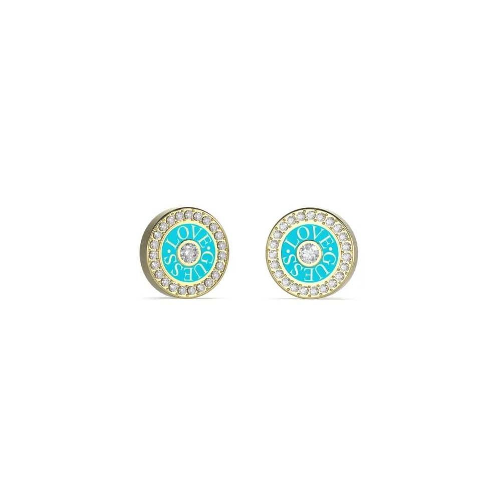 Orecchini a lobo da Donna in Acciaio dorato con smalto Turchese e Scritta Love Guess Love e Cristalli Bianchi.