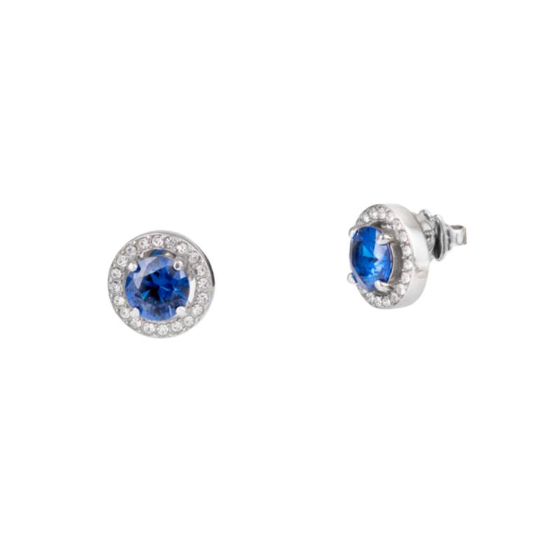 Orecchini in acciaio lucido, raffigura un punto luce con due zirconi blu incastonati e tanti piccoli zirconi bianchi intorno.