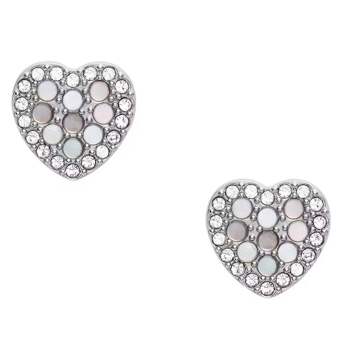 Orecchini a lobo in acciaio, dettagli in madreperla e zirconi bianchi.