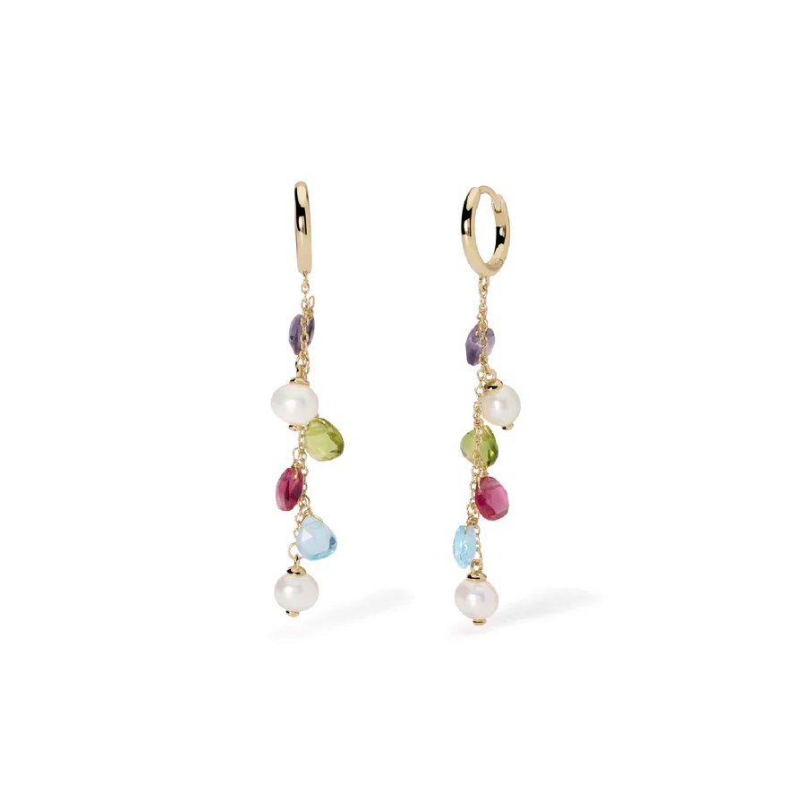 Orecchini da donna in argento placcato oro a cerchio con pendente impreziosito da glass multicolor taglio goccia e da perle coltivate