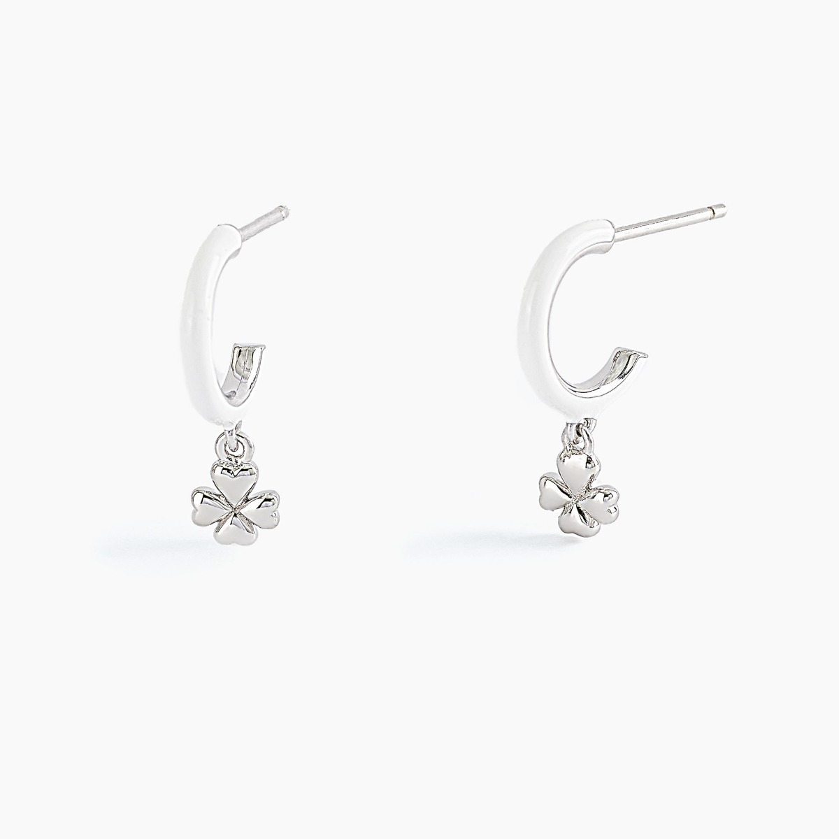 Orecchini a cerchio in argento smaltati bianchi con ciondolo a forma di quadrifoglio.