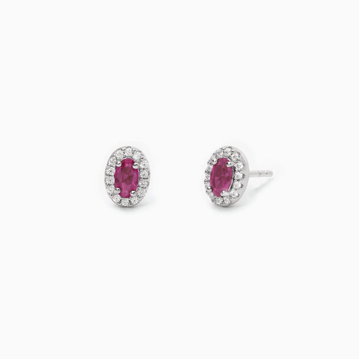 Orecchini da donna a lobo in argento rodiato con rubini sintetici taglio ovale circondati da zirconi bianchi.