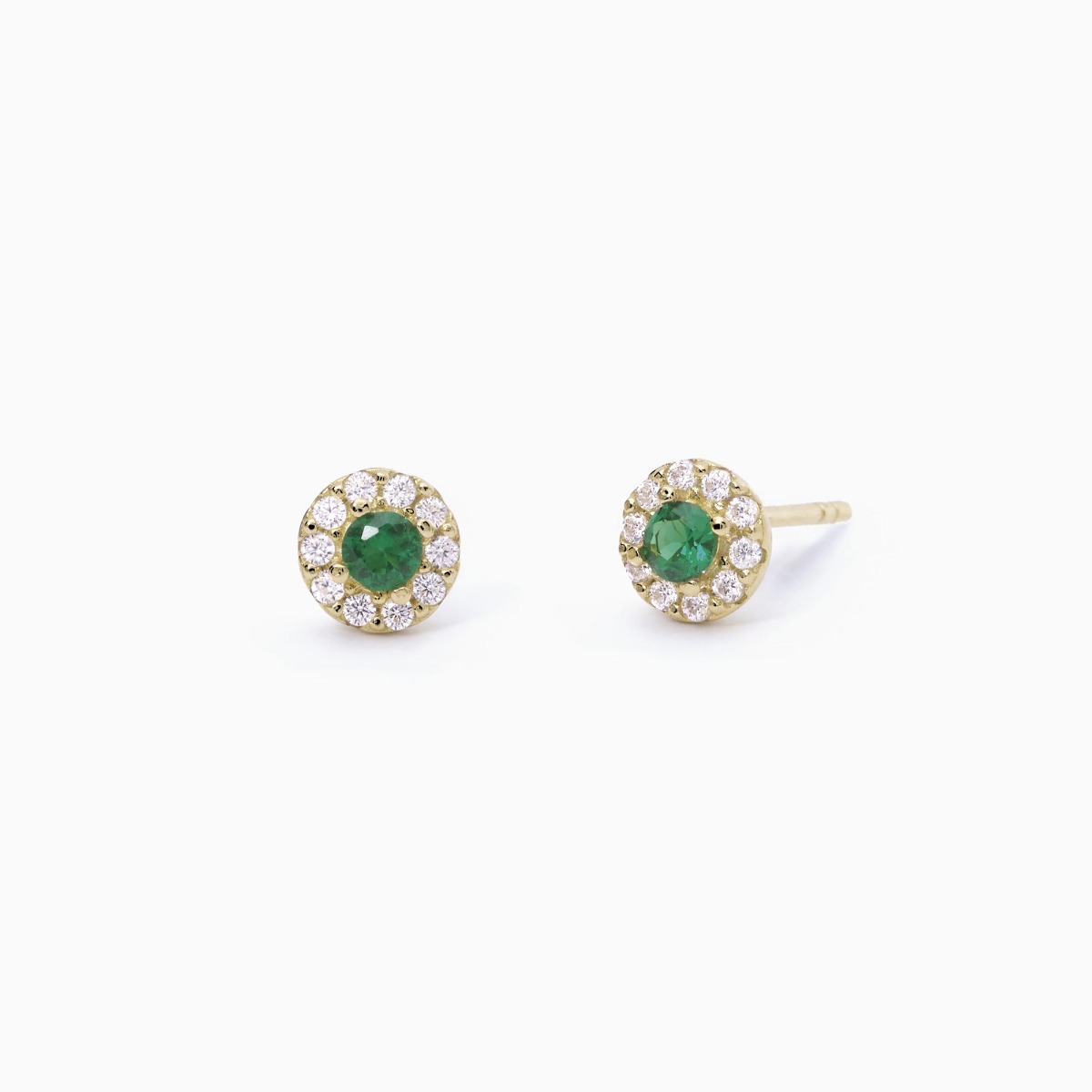 Orecchini a lobo in argento placcato oro 18K con smeraldi sintetici circondati da zirconi bianchi.