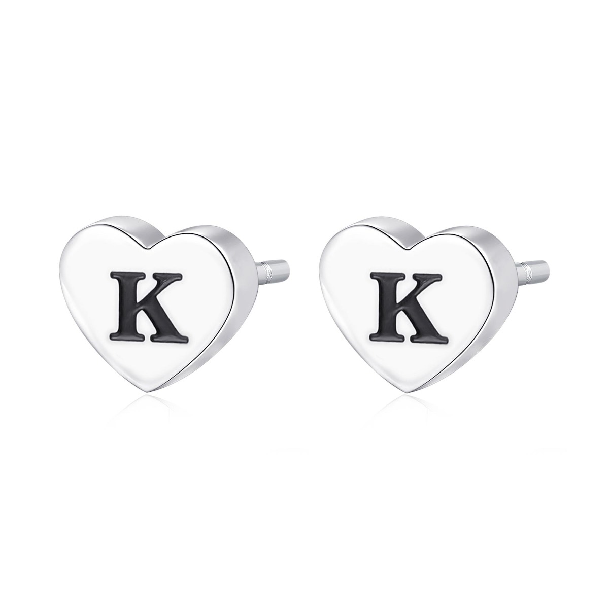 Orecchini a lobo a forma di cuore in acciaio 316L con lettera K e smalto nero.