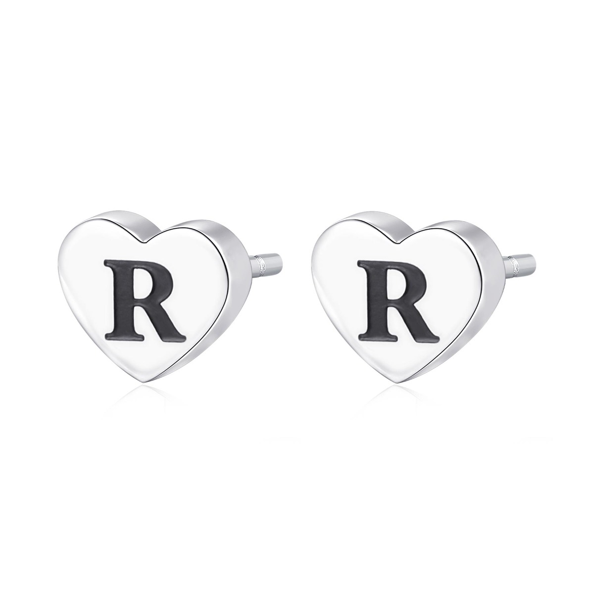 Orecchini a lobo a forma di cuore in acciaio 316L con lettera R e smalto nero.