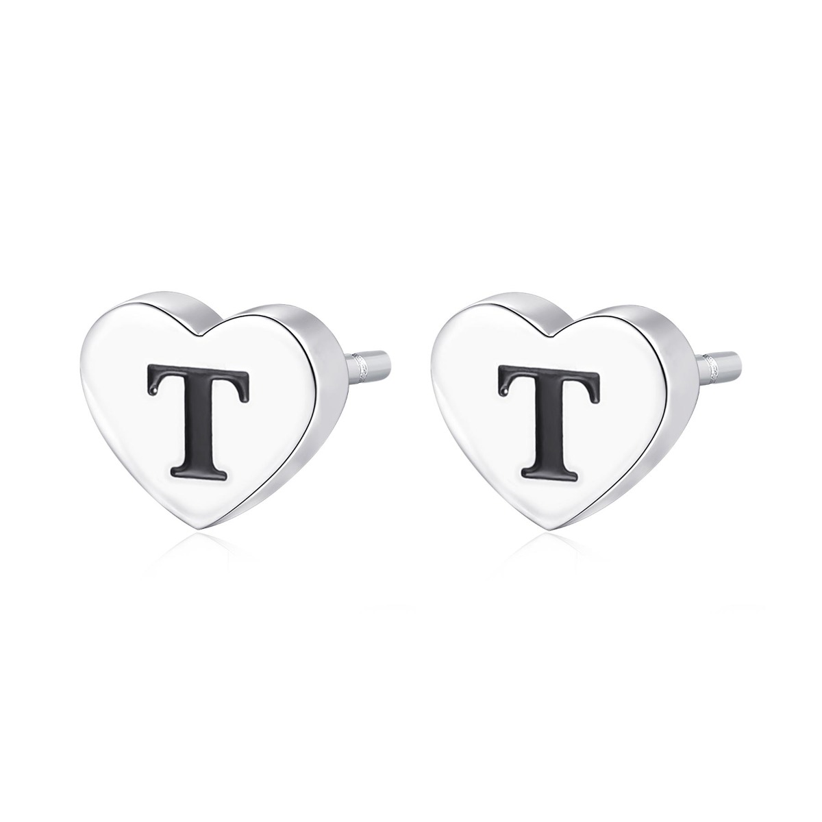 Orecchini a lobo a forma di cuore in acciaio 316L con lettera T e smalto nero.