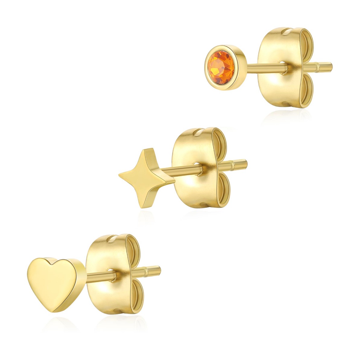 Set di tre mini orecchini in acciaio 316L, finitura pvd oro 14K con cristallo colore sun, a forma di cuore e stella polare.